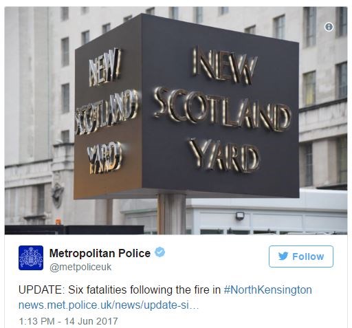 Η Μητροπολιτική Αστυνομία του Λονδίνου ανακοίνωσε, μέσω twitter, ότι στη φονική φωτιά έχασαν τη ζωή τους έξι ένοικοι.