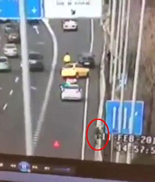 Παρά την πτώση του στο έδαφος ο αστυνομικός διασχίζει γρήγορα τον αυτοκινητόδρομο και πηδά πάνω από ένα μεταλλικό φράκτη δευτερόλεπτα πριν τον χτυπήσει το αυτοκίνητο.