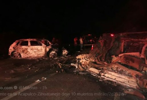 Δέκα άνθρωποι σκοτώθηκαν και άλλοι δύο τραυματίστηκαν όταν δύο αυτοκίνητα και μια μοτοσικλέτα συγκρούστηκαν και τυλίχθηκαν στις φλόγες στον αυτοκινητόδρομο που συνδέει το Ακαπούλκο και την παραθαλάσσια πόλη Ζιουατανέχο στην Πολιτεία Γκερέρο του Μεξικού.