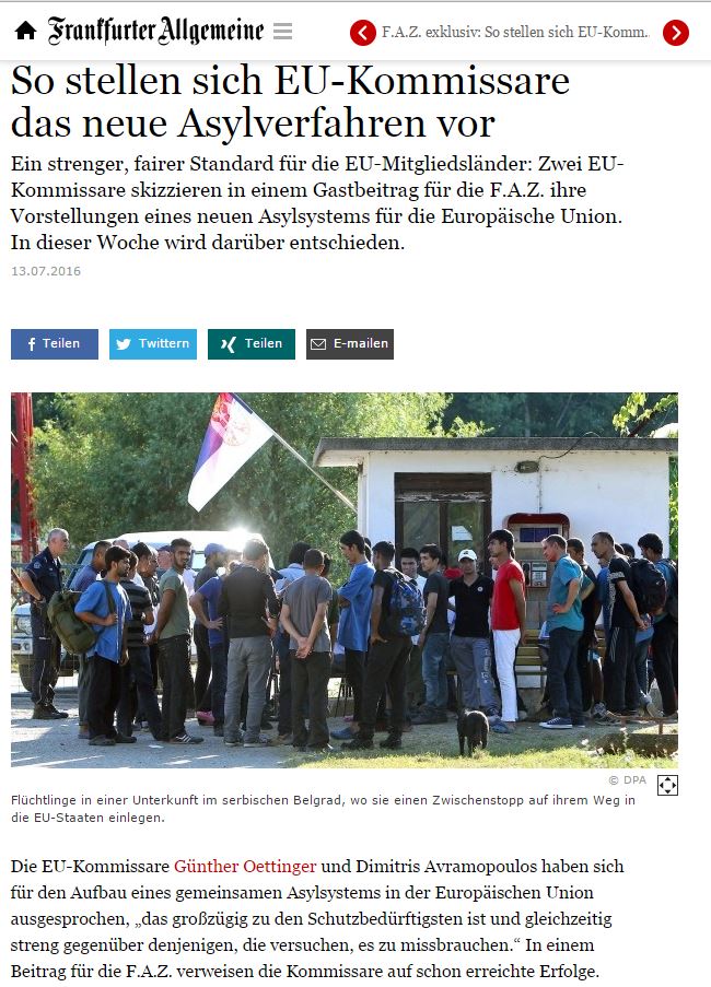 O Επίτροπος Ψηφιακής Οικονομίας και Κοινωνίας Γκίντερ Έτινγκερ και ο Επίτροπος Μετανάστευσης, Εσωτερικών Υποθέσεων και Ιθαγένειας Δημήτρης Αβραμόπουλος σε άρθρο τους το οποίο φιλοξενεί σήμερα η γερμανική εφημερίδα Frankfurter Allgemeine Zeitung περιγράφουν τη νέα διαδικασία παροχής ασύλου στην ΕΕ, η οποία προβλέπει αυστηρότερα, πλην δικαιότερα κριτήρια χορήγησής του, που θα ισχύει για όλες τις χώρες μέλη της ΕΕ. Η νέα διαδικασία θα αποφασισθεί από την Κομισιόν αυτή την εβδομάδα.