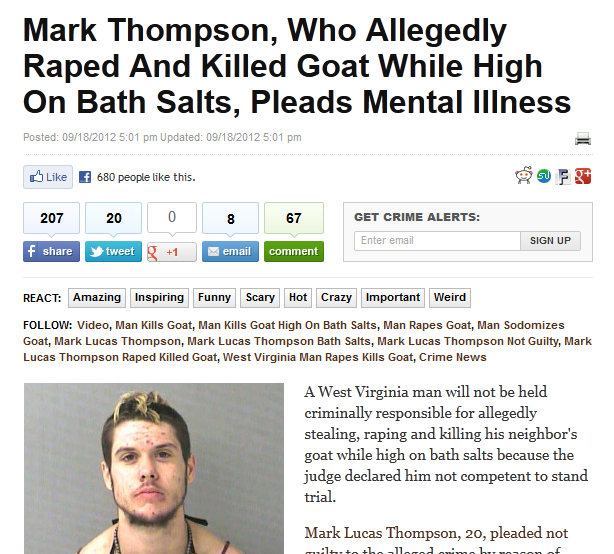 Ο 20χρονος Marc Loucas Thompson, από τη Δυτική Βιρτζίνια των ΗΠΑ, κατηγορήθηκε ότι άρπαξε, βίασε και σκότωσε την κατσίκα του γείτονά του, ενώ βρισκόταν υπό την επήρεια «αλάτων μπάνιου». Μάλιστα η αστυνομία βρήκε τη νεκρή κατσίκα στο υπνοδωμάτιο του να φοράει γυναικεία εσώρουχα. Στο δικαστήριο, ο 20χρονος επικαλέστηκε παράνοια και υπάρχει περίπτωση να γλιτώσει τη φυλακή.Οι γείτονες υποψιάστηκαν ότι ο νεαρός είχε αρπάξει την κατσίκα, καθώς τον είχαν δει να την παρατηρεί και να φέρεται παράξενα.