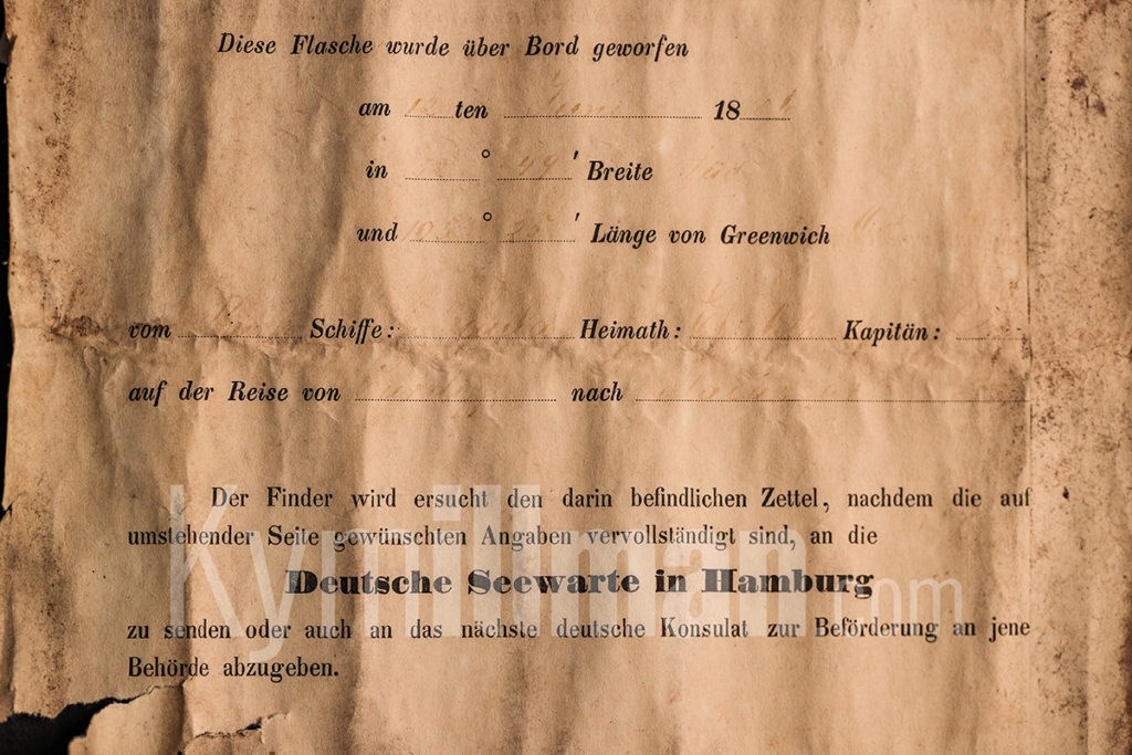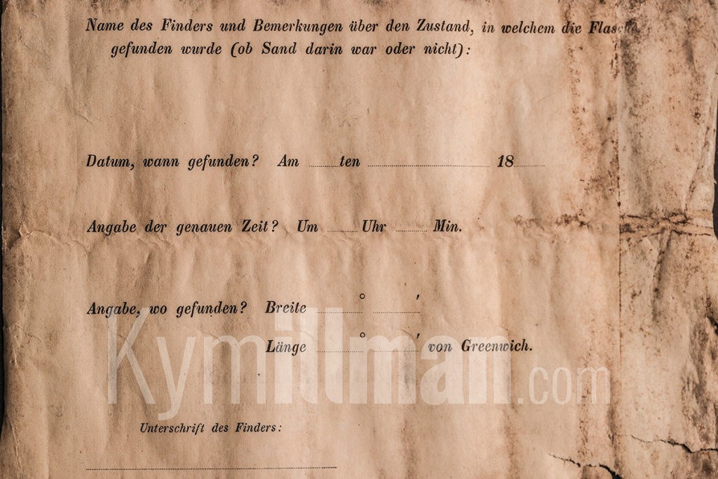 “Ήταν ένα παλιό όμορφο μπουκάλι και το μάζεψα σκεφτόμενη ότι θα ταίριαζε ωραία στη βιβλιοθήκη μου”, δήλωσε η ‘Ιλμαν, όπως αναφέρει η ανακοίνωση του Μουσείου Δυτικής Αυστραλίας. “Η κοπέλα του γιου μου βρήκε το μήνυμα προσπαθώντας να αδειάσει την άμμο από το μπουκάλι. Το σημείωμα ήταν μουσκεμένο, τυλιγμένο σφιχτά και δεμένο με σπάγκο. Το πήραμε στο σπίτι”, είπε προσθέτοντας ότι στη συνέχεια η παρέα στέγνωσε το μήνυμα πριν το ξεδιπλώσει και ανακαλύψει μια έντυπη εγγραφή στα γερμανικά και λέξεις που ήταν γραμμένες με το χέρι και σχεδόν σβησμένες.