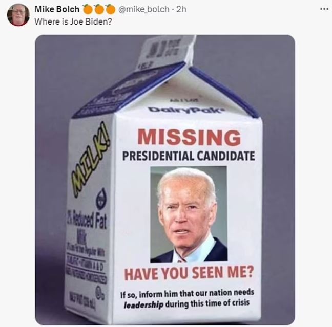 Εικόνες του Μπάιντεν έχουν τοποθετηθεί πάνω σε κουτιά γάλακτος ως «αγνοούμενος προεδρικός υποψήφιος» και άλλοι τον συνέκριναν με τη σειρά γρίφων «Πού είναι ο Γουάλντο;». Ο πρόεδρος Μπάιντεν πραγματοποίησε τηλεφωνική κλήση προς τους επιτελείς της προεκλογικής εκστρατείας τη Δευτέρα, ενώ ήταν σε απομόνωση λόγω της COVID, στο Rehoboth Beach του, στο Ντέλαγουερ.