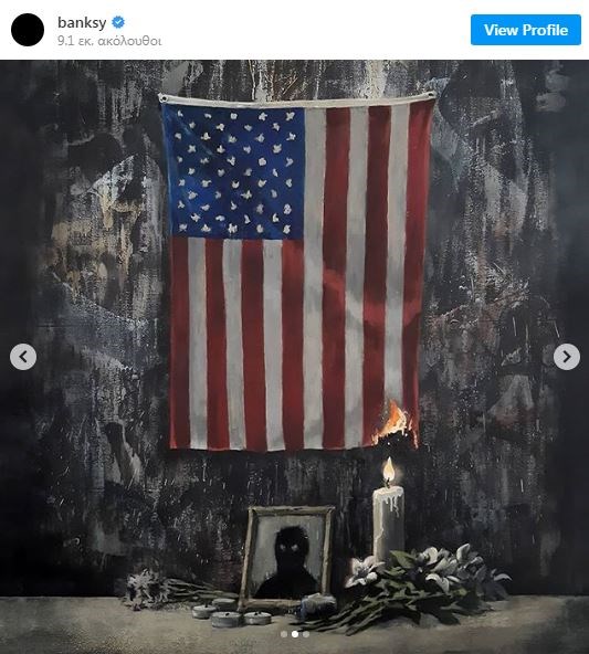 Ο αγνώστου στοιχείων street artist, Banksy, ανέβασε στο Instagram το νέο έργο του, το οποίο αφιέρωσε στον αδικοχαμένο Τζορτζ Φλόιντ, εκφράζοντας την συμπαράστασή του στους αγανακτισμένους πολίτες των ΗΠΑ αλλά και όλου του κόσμου.