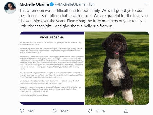 «Ως οικογένεια, ο Μπο θα μας λείψει πολύ», δήλωσε από την πλευρά της στο Instagram η πρώην πρώτη κυρία Μισέλ Ομπάμα.