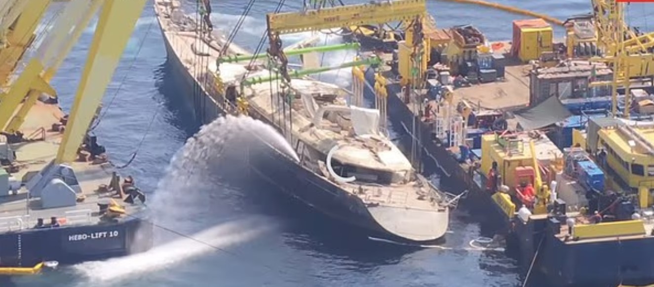 Σε βίντεο και φωτογραφίες που δημοσιεύουν τα διεθνή ΜΜΕ φαίνεται το γιοτ να υψώνεται στην επιφάνεια της θάλασσας από έναν τεράστιο γερανό.