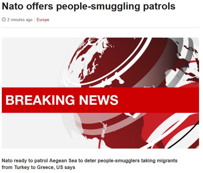 «Το ΝΑΤΟ είναι έτοιμο να ξεκινήσει περιπολίες στη θάλασσα του Αιγαίου με σκοπό να αποτρέψει τη διακίνηση μεταναστών από την Τουρκία προς την Ελλάδα», αναφέρει με breaking news το BBC.