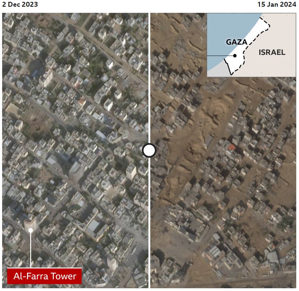Λεπτομερείς εικόνες πριν και μετά δείχνουν επίσης πώς ο βομβαρδισμός της νότιας και κεντρικής Γάζας έχει ενταθεί από τις αρχές Δεκεμβρίου, με την πόλη Χαν Γιουνίς να σηκώνει το μεγαλύτερο μέρος του βάρους της στρατιωτικής δράσης του Ισραήλ. Το Ισραήλ έχει επανειλημμένα πει στους κατοίκους της Γάζας να μετακινηθούν νότια για τη δική τους ασφάλεια.