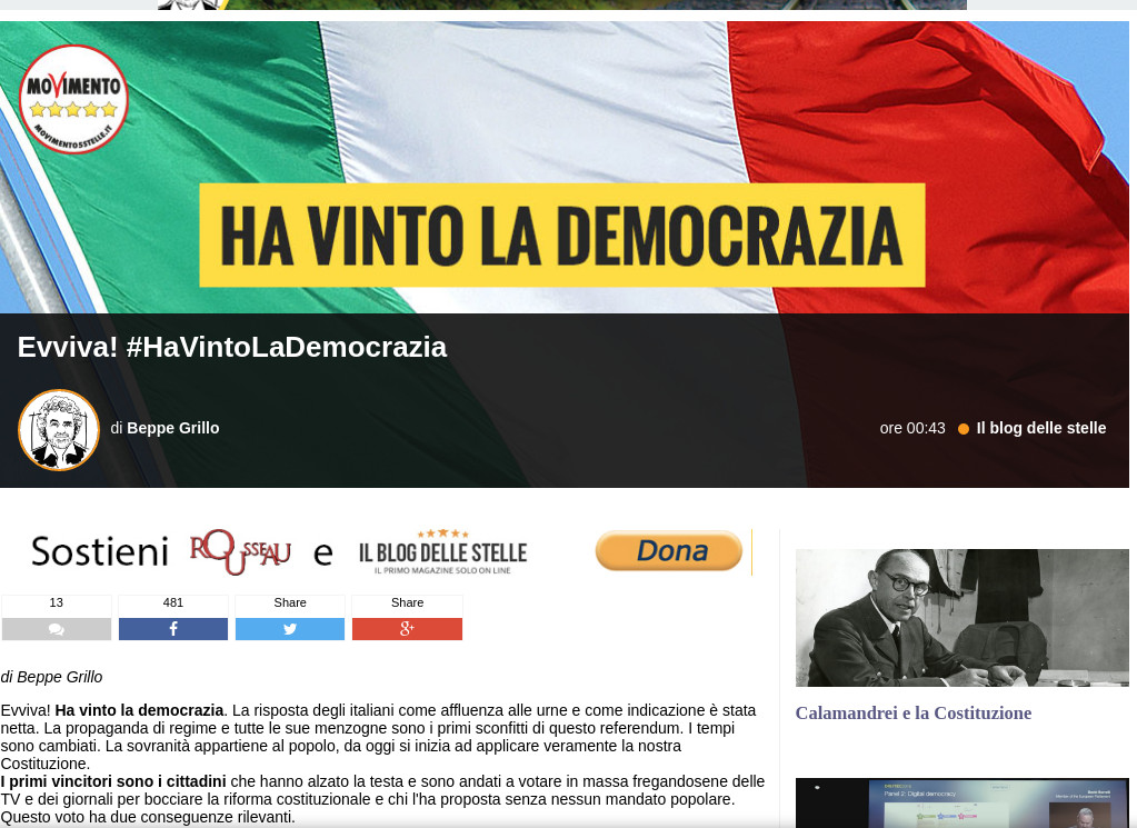 «Εβίβα! Κέρδισε η δημοκρατία. Η απάντηση των Ιταλών ήταν σαφής», σημείωνε ο Γκρίλο προσθέτοντας ότι «η προπαγάνδα του καθεστώτος και όλα τα ψέματα είναι οι μεγάλοι χαμένοι σε αυτό το δημοψήφισμα. Οι καιροί έχουν αλλάξει. Η κυριαρχία ανήκει στο λαό, από σήμερα θα αρχίσουμε να εφαρμόζουμε πραγματικά το Σύνταγμα».