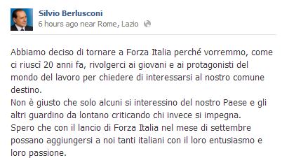 «Αποφασίσαμε να επιστρέψουμε στην Φόρτσα Ιτάλια διότι θέλουμε να καταφέρουμε, όπως συνέβη πριν από είκοσι χρόνια, να απευθυνθούμε στους νέους και στους πρωταγωνιστές του πεδίου των επιχειρήσεων, για να τους καλέσουμε να ενδιαφερθούν για το κοινό μας μέλλον», έγραψε μεταξύ άλλων ο Μπερλουσκόνι στον ιστότοπο κοινωνικής δικτύωσης Facebook.