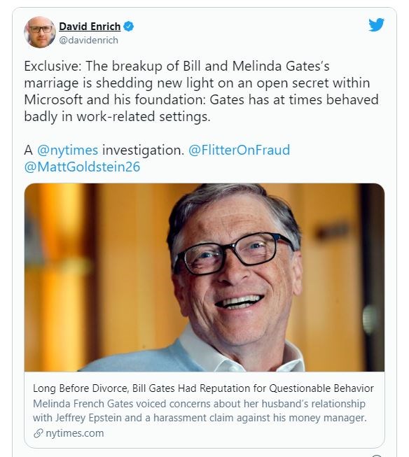 Ενώ η Μελίντα Φρεντς Γκέιτς αποφάσιζε να θέσει τέλος στον 27ετή γάμο της, ο Μπιλ Γκέιτς που είναι παγκοσμίως γνωστός ως πρωτοπόρος λογισμικού και δισεκατομμυριούχος, σε κάποιους κύκλους κυκλοφορούσε η φήμη για αμφισβητούμενη συμπεριφορά σε εργασιακό περιβάλλον, σύμφωνα με την έρευνα των New York Times.