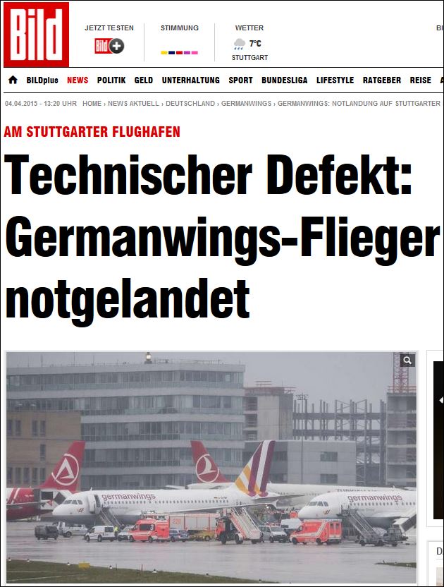 Σύμφωνα με πληροφορίες της Bild, λίγο πριν από τις 11 το πρωί (ώρα Ελλάδος) απογειώθηκε το αεροσκάφος της Germanwings που εκτελούσε την πτήση 4U 814 από την Κολωνία με προορισμό τη Βενετία. Περίπου μία ώρα αργότερα, το αεροσκάφος πραγματοποίησε αναγκαστική προσγείωση στη Στουτγκάρδη λόγω τεχνικού προβλήματος, όπως αναφέρει η γερμανική εφημερίδα, και συγκεκριμένα «απώλεια καυσίμων».