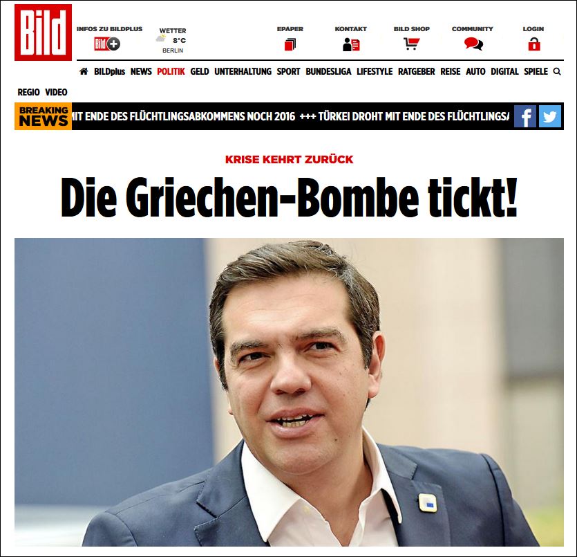 «Η ελληνική βόμβα χτυπάει» είναι ο τίτλος δημοσιεύματος της γερμανικής εφημερίδας Bild που κάνει λόγο για «επιστροφή της κρίσης».