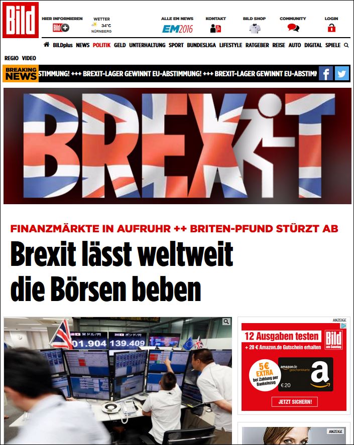 «Κέρδισαν οι αντίπαλοι της Ευρωπαϊκής Ένωσης» είναι ο τίτλος της γερμανικής εφημερίδας Bild, η οποία αφιερώνει πλήθος σχολίων και δημοσιευμάτων στο αποτέλεσμα του βρετανικού δημοψηφίσματος.