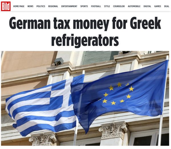«Λεφτά Γερμανών φορολογουμένων για ελληνικά ψυγεία», γράφει η Bild, αναφερόμενη στο πρόγραμμα επιδότησης για αλλαγή ηλεκτρικών συσκευών. «Ο προϋπολογισμός για αυτό (150 εκατ. ευρώ) προέρχεται από την ΕΕ που σημαίνει ότι και η Γερμανία πληρώνει.
