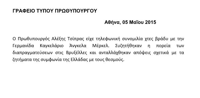 «Ο Έλληνας Πρωθυπουργός, Αλέξης Τσίπρας, τηλεφώνησε εκ νέου χθες, Δευτέρα, στη Γερμανίδα Καγκελάριο, Άνγκελα Μέρκελ, και σήμερα στέλνει τους οικονομικούς του πραγματογνώμονες στη Φρανκφούρτη, στο Παρίσι, και στις Βρυξέλλες» επισημαίνει η εφημερίδα, τονίζοντας ότι το τηλεφώνημα του Πρωθυπουργού έγινε 24 ώρες πριν από τα κρίσιμα ραντεβού που επίκεινται σήμερα, Τρίτη.