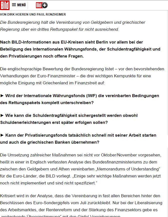 «Η κυβέρνηση της Γερμανίας πιστεύει ότι η συμφωνία μεταξύ της Ελλάδας και των διεθνών πιστωτών της για το τρίτο πακέτο στήριξης είναι ανεπαρκής», αναφέρει σήμερα η εφημερίδα Bild επικαλούμενη πηγές στην ΕΕ.