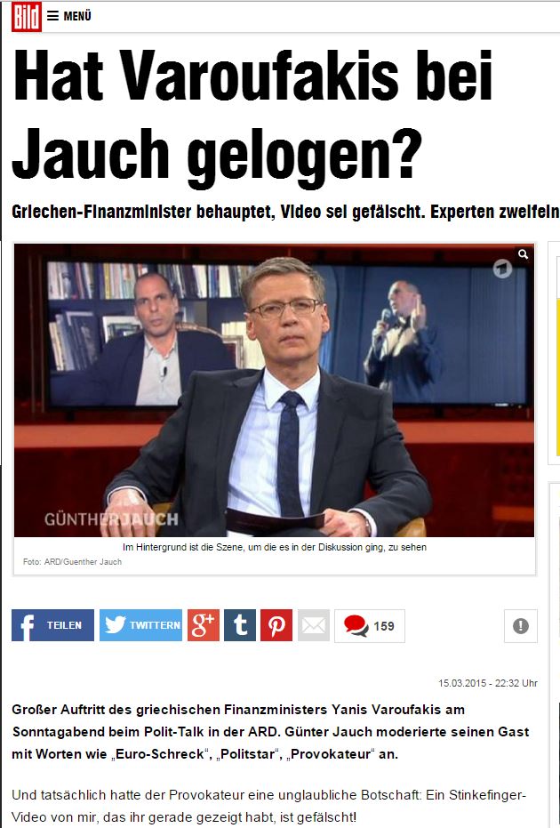 «Ο Βαρουφάκης είπε ψέματα στην εκπομπή του Γιάουχ;» και υπότιτλο «ο υπουργός Οικονομικών των Ελλήνων ισχυρίζεται ότι το βίντεο είναι παραποιημένο – ειδικοί αμφιβάλλουν», η εφημερίδα BILD δημοσιεύει στην ηλεκτρονική της έκδοση ρεπορτάζ, σύμφωνα με το οποίο το βίντεο το οποίο προέβαλε η εκπομπή του Γκίντερ Γιάουχ, όπου ο Γιάνης Βαρουφάκης εμφανίζεται σε άσεμνη χειρονομία για τους Γερμανούς, δεν είναι μονταρισμένο, όπως ισχυρίστηκε ο ίδιος.