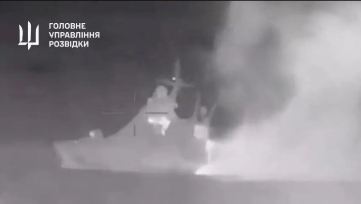 Ένα βίντεο φαίνεται να δείχνει ένα περιπολικό πλοίο του ρωσικού στόλου της Μαύρης Θάλασσας 65 εκατομμυρίων δολαρίων να χτυπιέται από ουκρανικά drones κατά τη διάρκεια της νύχτας, στέλνοντας σύννεφα συντριμμιών στον αέρα προτού βυθιστεί.