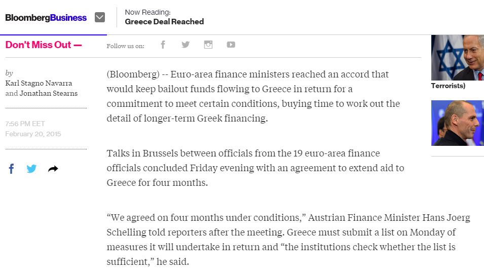 «Οι υπουργοί Οικονομικών της ευρωζώνης κατέληξαν σε συμφωνία που θα συνεχίσει τη ροή κεφαλαίων προς την Ελλάδα, στο πλαίσιο της δανειακής σύμβασης», αναφέρεται σε δημοσίευμα του ειδησεογραφικού πρακτορείου Bloomberg, προσθέτοντας «με αντάλλαγμα τη δέσμευση της Ελλάδας να πληροί ορισμένες προϋποθέσεις, αγοράζοντας χρόνο για να επεξεργαστεί τις λεπτομέρειες της χορήγησης των μακροπρόθεσμων χρηματοδοτήσεων».