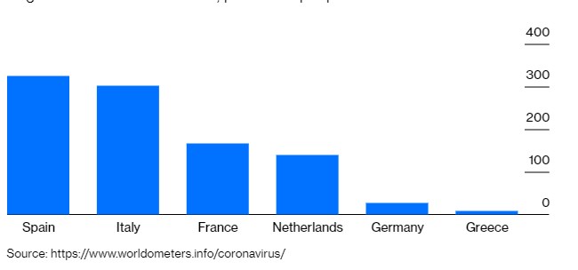 “Μέχρι στιγμής η Ελλάδα έχει 1.955 κρούσματα και 86 θανάτους, που είναι 188 κρούσματα και 8 θάνατοι ανά ένα εκατομμύριο ανθρώπων. Η Ισπανία έχει 3.261 κρούσματα και 326 θανάτους ανά ένα εκατομμύριο ανθρώπων και η Ιταλία έχει 2.375 κρούσματα και 302 θανάτους ανά ένα εκατομμύριο ανθρώπων. Αυτό μπορεί να οφείλετε στο γεγονός ότι η Ελλάδα έχει κάνει λιγότερα από τα μισά τεστ από ότι έχει κάνει η Ισπανία και ένα τέταρτο από όσα έχει κάνει η Ιταλία, αλλά δεν υπάρχουν σημάδια ότι η πίεση στο σύστημα Υγείας της είναι συγκρίσιμη με αυτό που έχουν βιώσει οι άλλες δύο χώρες. Η ελληνική κυβέρνηση επίσης τονίζει ότι έχει προσλάβει 4.200 νέους γιατρούς και αύξησε τις κλίνες ΜΕΘ, που θα βοηθήσει στην αντιμετώπιση αν χειροτερεύσει η κρίση. Ο Κυριάκος Μητσοτάκης αναδύθηκε ως η φωνή της λογικής στην παγκόσμια σκηνή. Για παράδειγμα έκανε κριτική στον Πρόεδρο της Βραζιλίας επειδή αρνήθηκε την σοβαρότητα της πανδημίας. Το πολιτικό σύστημα της Ελλάδας στο σύνολό του, μαζί με την αξιωματική αντιπολίτευση του ΣΥΡΙΖΑ, αντέδρασε με ψυχραιμία, μια πολύ διαφορετική εικόνα από τις εσωτερικές διαμάχες που είδαμε στην Ισπανία. Ενώ και οι Έλληνες εμφανίζονται να σέβονται τους κανόνες του lockdown, εν μέρει είναι αποτέλεσμα και των προστίμων από την κυβέρνηση στους παραβάτες. Το πιο ανησυχητικό είναι το τι θα μπορούσε να γίνει στην ελληνική οικονομία. Η πανδημία ήρθε σε άσχημη στιγμή για την Αθήνα. Έπειτα από μια δεκαετία οικονομικής κρίσης, τα πράγματα είχαν αρχίσει να επιστρέφουν στην κανονικότητα. Ο Πρωθυπουργός, Κυριάκος Μητσοτάκης, κέρδισε με πλειοψηφία στις εκλογές του 2019, υποσχόμενος να αποκαταστήσει την αξιοπιστία της χώρας στο εξωτερικό και να επαναφέρει την οικονομία. Οι επενδυτές επέστρεψαν στην Ελλάδα σε αναζήτηση ευκαιριών” προσθέτει.
