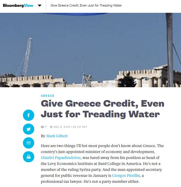 Αναφέρει ότι οι προοπτικές της ελληνικής οικονομίας έχουν βελτιωθεί, με τον ετήσιο ρυθμό ανάπτυξης να φθάνει στο 1,8% στο τρίτο τρίμηνο του 2016, ξεπερνώντας αυτόν της Γερμανίας και της Ευρωζώνης ως σύνολο, καθώς και ότι οι καταθέσεις επιστρέφουν στις τράπεζες του τελευταίους μήνες. «Τα κρατικά έσοδα βελτιώνονται, επίσης. Τα αναμενόμενα για φέτος συνολικά έσοδα ύψους 50,5 δισ. ευρώ θα είναι αυξημένα κατά 7% σε σχέση με το χαμηλό τους επίπεδο του 2013, ενώ η φορολογική διοίκηση προβλέπει περαιτέρω αύξησή τους το επόμενο έτος», σημειώνει ο αρθρογράφος.