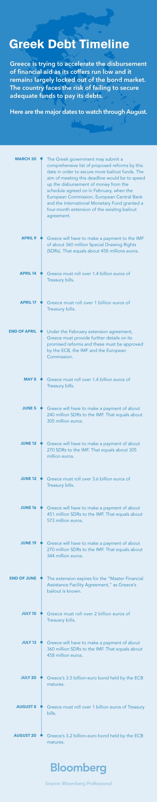 Το Bloomberg αναφέρει στην δημοσίευση του με την λίστα των κρίσιμων ημερών ότι «Η Ελλάδα προσπαθεί να επιταχύνει την εκταμίευση της οικονομικής βοήθειας , όμως τα ταμεία είναι άδεια και η χώρα παραμένει κλειδωμένη έξω από την αγορά ομολόγων. Η Ελλάδα αντιμετωπίζει τον κίνδυνο να μην μπορέσει να εξασφαλίσει επαρκή κεφάλαια για να πληρώσει τα χρέη της».