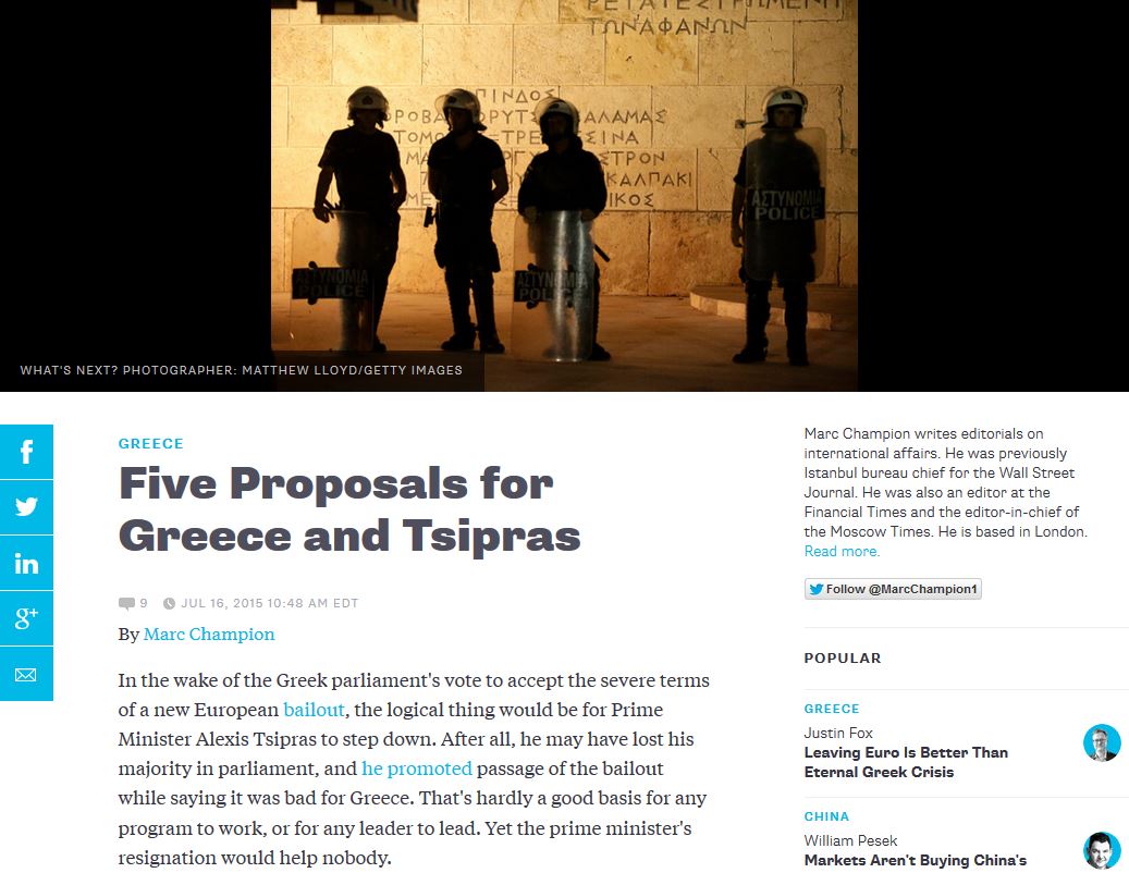 Η παραίτηση του Έλληνα πρωθυπουργού δεν θα ήταν ωφέλιμη για κανέναν σχολιάζει άρθρο του Μαρκ Τσάμπιον στo Bloomberg View προτείνοντας πέντε σημεία για την επόμενη μέρα. Ο Α. Τσίπρας είναι η κυρίαρχη φιγούρα στην πολιτική ερημιά της Ελλάδας, εξηγεί.