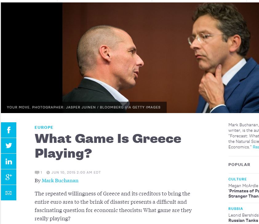 «Αυτή η ερμηνεία, όμως, προϋποθέτει ότι τα δυνητικά κέρδη και οι ζημίες για τους δύο παίκτες είναι περίπου συμμετρικά – μια κατάσταση που όμως στη συγκεκριμένη περίπτωση δεν μπορεί να ισχύει με δεδομένα τα μεγάλα μειονεκτήματα που έχει η Ελλάδα», υπογραμμίζει. Έτσι και οι δύο πλευρές επιστρέφουν «στο κλασικό παιχνίδι του τελεσίγραφου», εξηγεί.