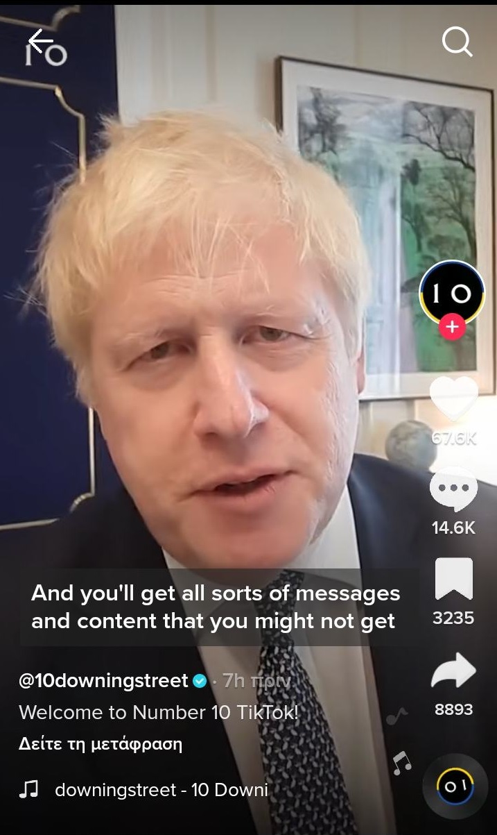Ο Τζόνσον εμφανίστηκε στο πρώτο βίντεο του λογαριασμού 10downingstreet στο TikTok και συγκέντρωσε περίπου μισό εκατομμύριο θεάσεις και δεκάδες χιλιάδες ακολούθους μέσα σε λίγες ώρες. “Γεια σας παιδιά, είμαι ο Μπόρις Τζόνσον και παρουσιάζω τον λογαριασμό του Νο 10 στο TikTok”, είπε μεταξύ άλλων ο Μπόρις Τζόνσον και πρόσθεσε: