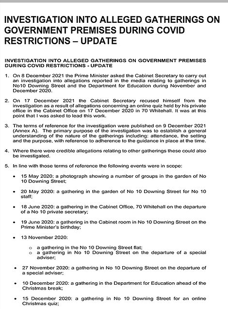 Από αυτές, οι τέσσερις δεν έφτασαν στο σημείο της έρευνας από την Αστυνομία. Μία από αυτές, που ερευνάται, σύμφωνα με το έγγραφο, είναι μία συγκέντρωση στο διαμέρισμα της Ντάουνινγκ Στριτ στις 13 Νοεμβρίου 2020, σύμφωνα με το BBC. Αυτή ενδέχεται να βλάψει ανεπανόρθωτα τον πρωθυπουργό. Ως δικαιολογία για κάποιες εκδηλώσεις που έγιναν στην Ντάουνινγκ Στριτ θεωρείται το γεγονός ότι το Νο10 είναι και χώρος εργασίας πέρα από πρωθυπουργική κατοικία. Ένα επιχείρημα που ωστόσο δεν μπορεί να στηριχθεί για όλα όσα συνέβησαν στο διαμέρισμα του Μπόρις Τζόνσον, όπου είναι η ιδιωτική του κατοικία.