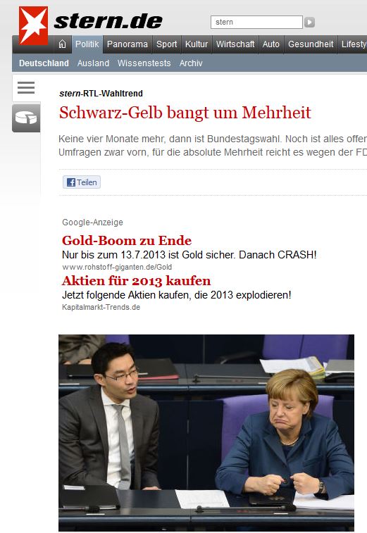 Οι Χριστιανοδημοκράτες χάνουν μια μονάδα από την περασμένη εβδομάδα και βρίσκονται στο 40%, ωστόσο ο κυβερνητικός εταίρος τους, οι Ελεύθεροι Δημοκράτες (FDP) παραμένουν στο 4%, κάτω από το όριο εισόδου στην Βουλή (5%). Οι Σοσιαλδημοκράτες (SPD) διατηρούν το 24%, οι Πράσινοι κερδίζουν μία μονάδα και φθάνουν το 14%, ενώ η Αριστερά μένει σταθερή στο 8%. Σταθεροί στο 3% παραμένουν τόσο οι Πειρατές όσο και το νεοσύστατο κόμμα “Εναλλακτική για την Γερμανία” (AfD).