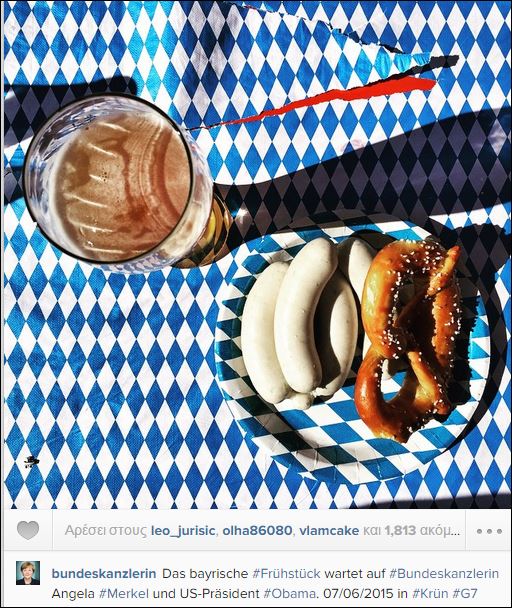 Όπως φαίνεται στη φωτογραφία που ανέβηκε στον λογαριασμό της καγκελαρίου στο Instagram, η Μέρκελ κέρασε τον Ομπάμα βαυαρικό πρωινό, λίγο πριν την έναρξη της Συνόδου των G7.