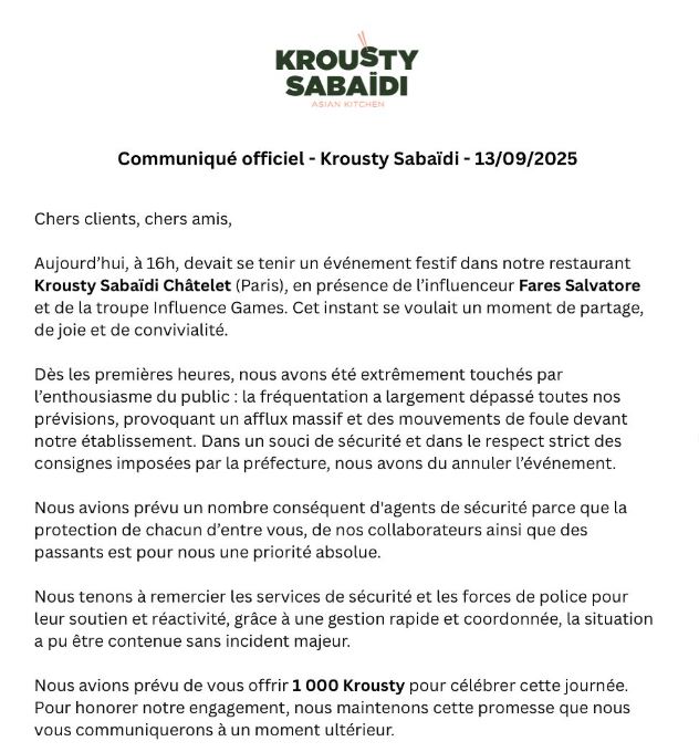 Η προγραμματισμένη γιορτή για τα εγκαίνια ενός νέου καταστήματος της αλυσίδας ασιατικού φαγητού Krousty Sabaidi, στο Παρίσι, μετατράπηκε σε χάος, καθώς η παρουσία ενός influencer προσέλκυσε πολύ μεγαλύτερο πλήθος από το αναμενόμενο, αναφέρει η Le Figaro.