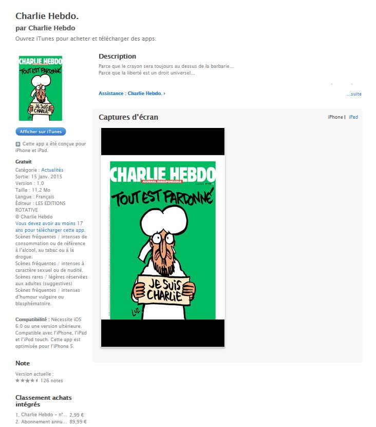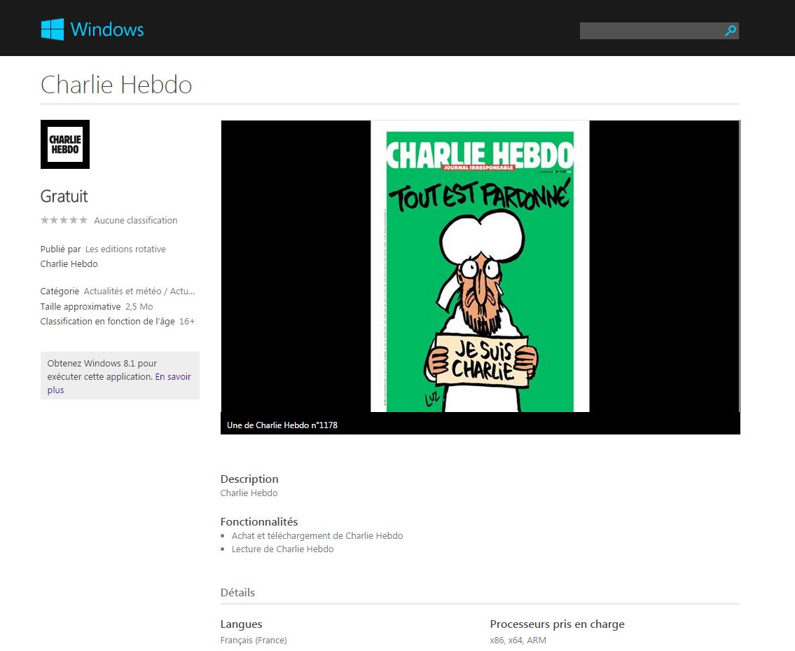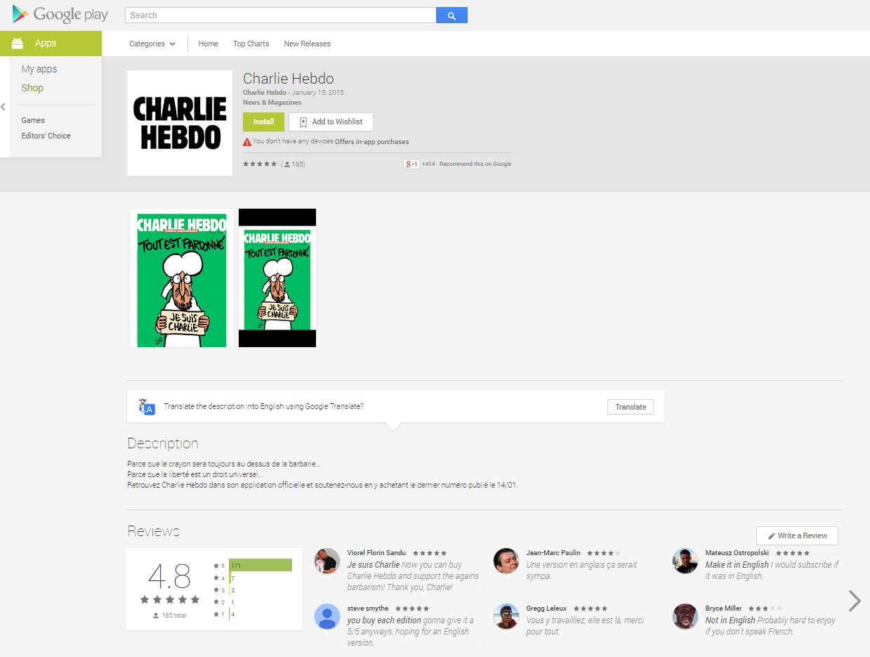Η Charlie Hebdo δημιούργησε μία εφαρμογή που θα επιτρέπει τους αναγνώστες της εφημερίδας να την μεταφορτώνουν, ιδίως το τελευταίο φύλλο της που εξέδωσαν οι επιζώντες της επίθεσης που διέπραξαν τζιχαντιστές εναντίον της συντακτικής της ομάδας, όπως ανακοίνωσε σήμερα η διεύθυνσή της, καθώς για δεύτερη ημέρα τα φύλλα της είναι εξαντλημένα.