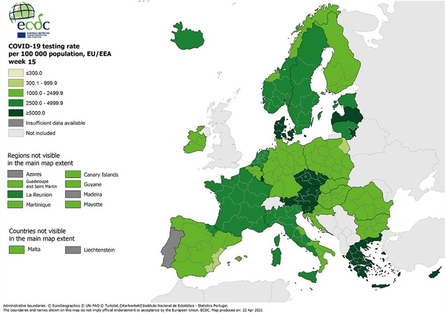 Στο «πράσινο» βρίσκεται, πλέον, η Ελλάδα στον δείκτη θετικότητας, σύμφωνα με αναθεωρημένο εβδομαδιαίο χάρτη του Ευρωπαϊκού Κέντρου Πρόληψης και Ελέγχου Νόσων (ECDC), ενώ κατατάσσεται στις λίγες χώρες με τους περισσότερους ελέγχους στην Ευρώπη. Συγκεκριμένα, η Ελλάδα είναι με δείκτη θετικότητας κάτω του 4%, ενώ είναι στο «βαθύ πράσινο» στο επίπεδο των ελέγχων, με δεδομένο πως στη χώρα μας διενεργούνται περισσότερα από 5.000 τεστ ανά 100.000 κατοίκους.