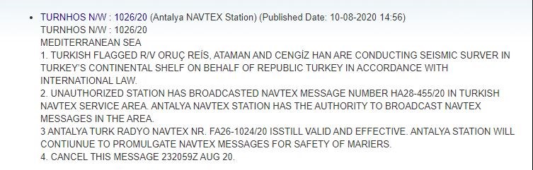 Η Τουρκία απάντησε με αντι-ΝAVTEX στην ελληνική αντι-NAVTEX που εξέδωσε νωρίτερα ο υδρογραφικός σταθμός του Ηρακλείου Κρήτης του Πολεμικού Ναυτικού. Στη νέα NAVTEX ισχυρίζονται ότι το Ορούτς Ρέις θα διεξάγει έρευνες εντός της “τουρκικής υφαλοκρηπίδας”.