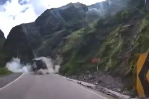 Τεράστιοι ογκόλιθοι πέφτουν κάτω από μια βουνοπλαγιά στο Περού και χτύπησαν φορτηγά που περνούσαν από τον δρόμο το Σάββατο σε μια συγκλονιστική στιγμή που ως εκ θαύματος δεν σκότωσε κανέναν.