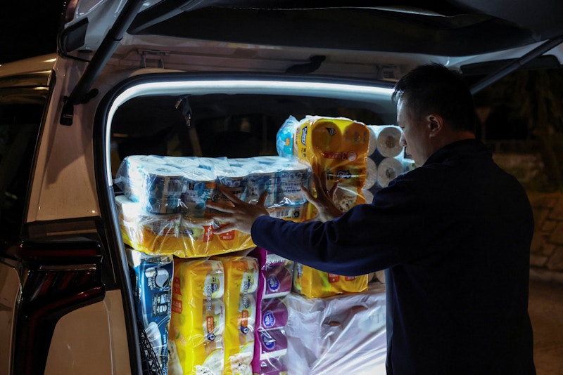 Κάτοικοι του Χονγκ Κονγκ μεταφέρουν προμήθειες στο συγκρότημα Wang Fuk για τους ανθρώπους που έχουν μείνει άστεγοι. Το συγκρότημα φιλοξενούσε περισσότερους από 4.600 ανθρώπους.