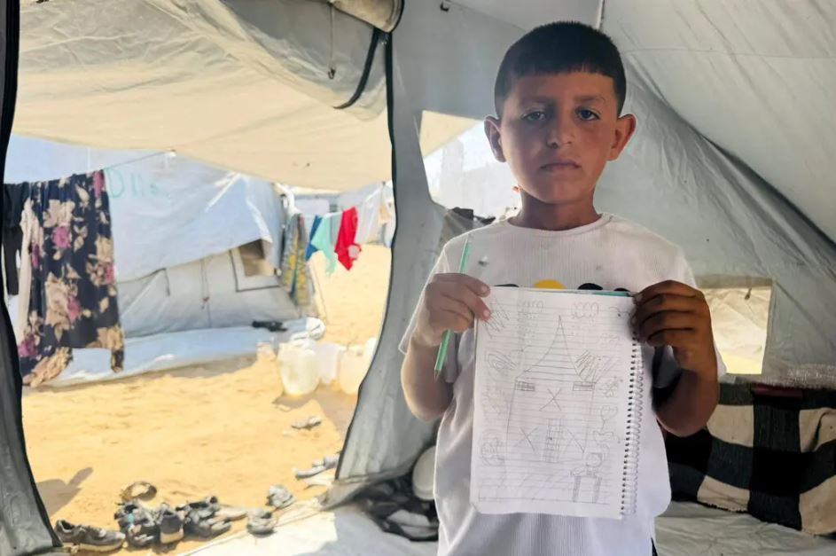 Σε μια σελίδα του τετραδίου του, ο 10χρονος Σάτζεντ αλ-Γκαλμπάν έχει ζωγραφίσει τη μητέρα και τον πατέρα του στο παλιό τους σπίτι στη Χαν Γιούνις, στη νότια Γάζα. Σε άλλη σελίδα, έχει ζωγραφίσει τη μητέρα του να τον πηγαίνει σε έναν πάγκο με λαχανικά.