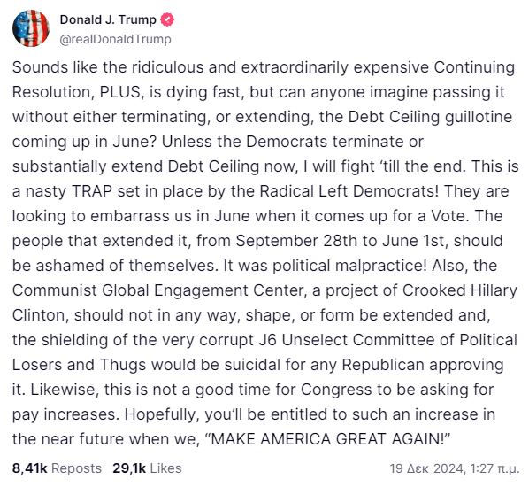 Τα μέλη του Κογκρέσου, αν και ανέμεναν μια ομαλή μετάβαση προς τη νέα εποχή διακυβέρνησης Τραμπ, ιδιαίτερα εν μέσω των εορτών, είχαν προχωρήσει σε μια διακομματική συμφωνία που θα διατηρούσε τη χρηματοδότηση της κυβέρνησης. Ωστόσο, στη συνέχεια, μέσα σε λίγες ώρες, πήραν μια -πικρή- γεύση για το πώς μπορεί να είναι τα επόμενα τέσσερα χρόνια με τον Τραμπ στο τιμόνι και τον Μασκ συνοδηγό.