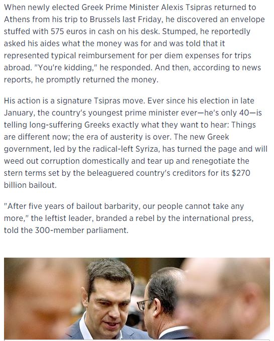 Στην αρχή του εκτενούς δημοσιεύματος σημειώνεται ότι ο νεοεκλεγείς πρωθυπουργός της Ελλάδας, Αλέξης Τσίπρας, «έμεινε άναυδος» όταν επέστρεψε στην Αθήνα από το ταξίδι του στις Βρυξέλλες, την περασμένη Παρασκευή και βρήκε πάνω στο γραφείο του ένα φάκελο με 575 ευρώ, σύμφωνα με πληροφορίες και όπως του είπαν, το ποσό αντιπροσώπευε τις ημερήσιες αποζημιώσεις για τα έξοδα του ταξιδιού του στο εξωτερικό. «Αστιεύεστε» τους είπε ο πρωθυπουργός και τότε, σύμφωνα με δημοσιεύματα, επέστρεψε αμέσως τα χρήματα.