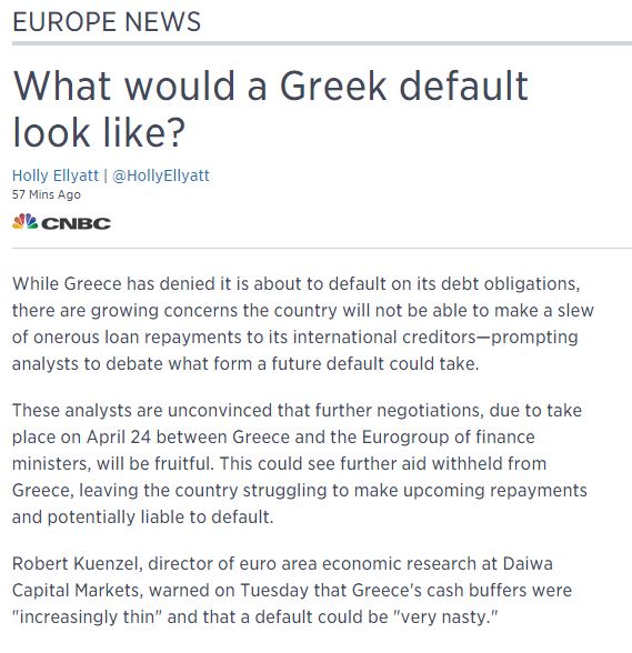 Το δημοσίευμα τονίζει πως παρά το γεγονός ότι η ελληνική κυβέρνηση διαψεύδει τις πληροφορίες που πριν από μερικές ώρες είδαν το “φως της δημοσιότητας”, ότι η χώρα προετοιμάζεται για μια χρεοκοπία στο τέλος του μήνα, οι ανησυχίες ότι η Ελλάδα δεν θα καταφέρει να εκπληρώσει τις υποχρεώσεις της, μεγαλώνουν, γεγονός που οδηγεί πολλούς οικονομολόγους να κάνουν σενάρια για το μέλλον της χώρας, αν τελικά χρεοκοπήσει.