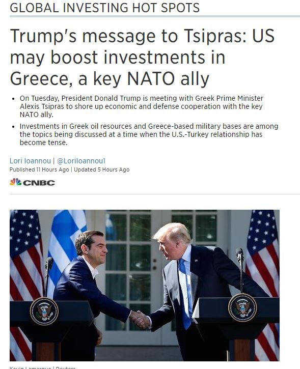 Με τίτλο «Το μήνυμα του Τραμπ στον Τσίπρα: οι ΗΠΑ μπορεί να αυξήσουν τις επενδύσεις στην Ελλάδα, έναν σύμμαχο κλειδί στο NATO», αναφέρθηκε το αμερικανικό τηλεοπτικό δίκτυο CNBC στη συνάντηση των δύο ηγετών.