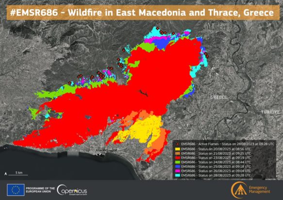 Our #RapidMappingTeam delivered its 6⃣th Monitoring Product for the historic #wildfire that continues to ravage the areas north of #Alexandroupolis