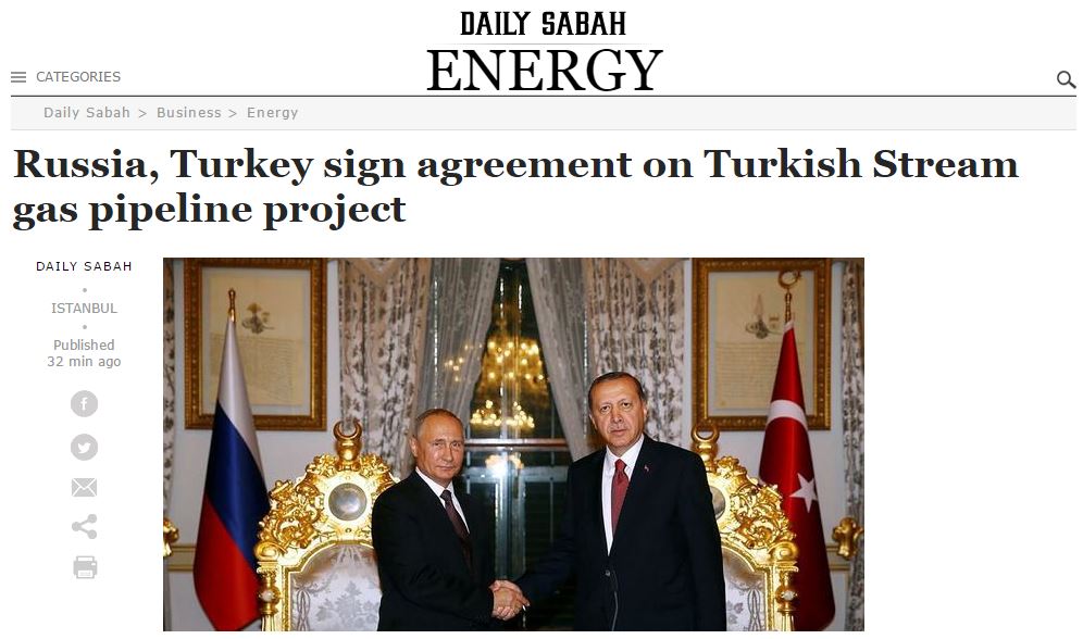 Daily Sabah: Πούτιν και Ερντογάν υπέγραψαν τη συμφωνία για τον αγωγό Turkish Stream