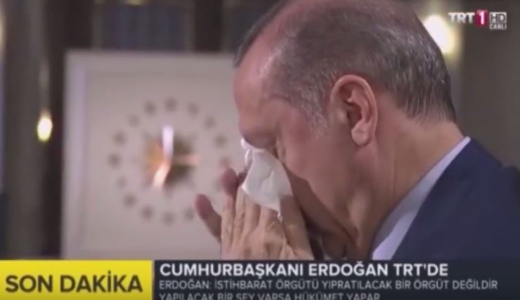 Ο Ερντογάν έδωσε το «παρών» σε ειδική εκπομπή του κρατικού τηλεοπτικού δικτύου TRT για το πραξικόπημα της 15ης Ιουλίου και η κάμερα κατέγραψε τη στιγμή που ο Πρόεδρος της Τουρκίας σκουπίζει τα δάκρυα του.