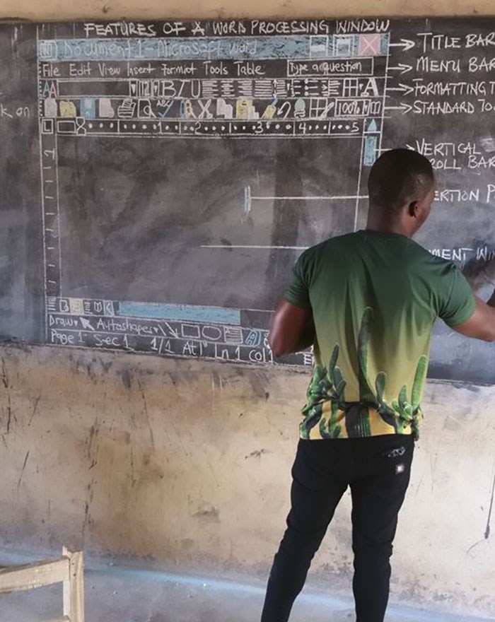 Έχοντας σπουδάσει εικαστικές τέχνες, ο Οβούρα Κβάντο αποφάσισε να αξιοποιήσει τις δεξιότητές του διδάσκοντας με τη δημιουργία ενός εγγράφου του Word, σχεδιάζοντας ένα πλήρες στιγμιότυπο οθόνης στον πίνακα για να το αντιγράψουν και να το μάθουν οι μαθητές του. «Το κάνω για να κατανοήσουν οι μαθητές μου τι διδάσκω. Τουλάχιστον να δώσω μια εικόνα για το τι θα έβλεπαν αν ήταν πίσω από έναν υπολογιστή».