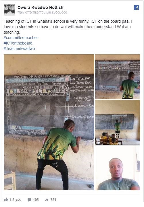 Viral έχει γίνει η ανάρτηση στο Facebook ενός δασκάλου στη Γκάνα που κατόρθωσε να κερδίσει τις καρδιές πολλών ανθρώπων, χάρη στις ασυνήθιστες και αυτοσχέδιες μεθόδους διδασκαλίας.