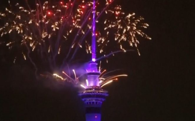Το σόου πυροτεχνημάτων από τον ύψους 328 μέτρων Sky Tower του Όκλαντ φώτισε τον συννεφιασμένο νυχτερινό ουρανό και συνοδεύτηκε από ένα σόου με φως λέιζερ και κινούμενα σχέδια.